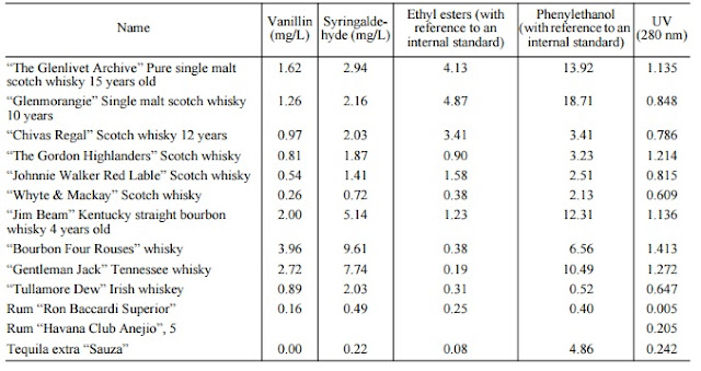 | Analysis of different spirits by GC-MS (Savchuk 2001) Note the high levels of vanillin from new charred casks. |